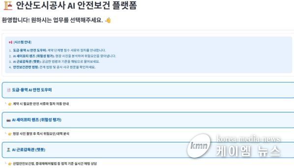 (케이엠뉴스) 안산도시공사는 생성형 인공지능(AI) 기술을 접목한 ‘AI 안전보건 플랫폼’을 자체 개발해 현장 사고 예방 업무에 본격적으로 활용한다고 25일 밝혔다.