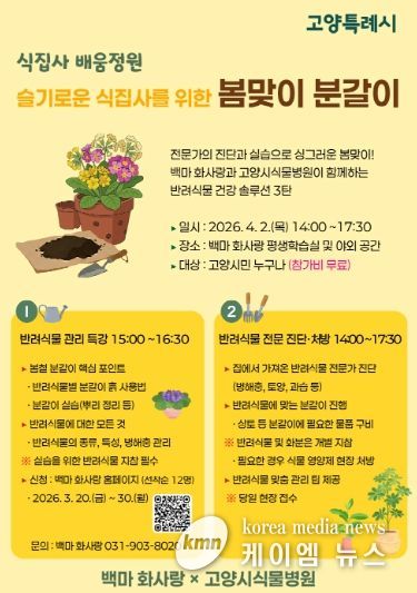 (케이엠뉴스) 고양특례시는 시민의 정서·마음 치유를 위한 ‘식집사 배움정원, 반려식물 돌보기 과정’을 오는 4월 2일부터 운영한다.