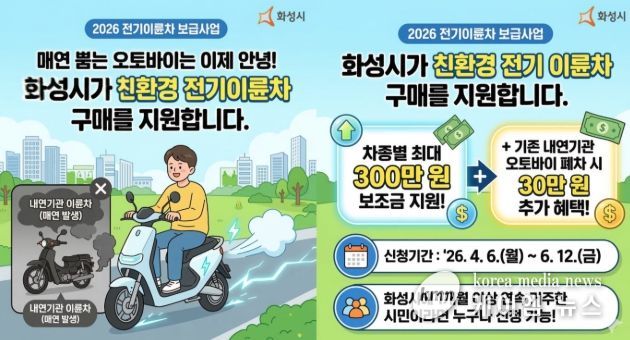 (케이엠뉴스) 화성특례시가 온실가스 감축과 대기환경 개선을 위해 2026년도 상반기 전기 이륜차 보급 사업 신청자 모집을 한다고 25일 밝혔다.