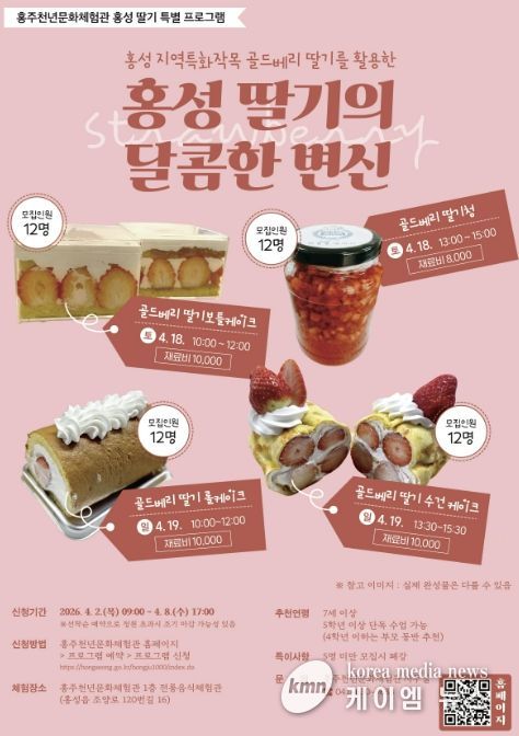 (케이엠뉴스) 홍성군 홍주천년문화체험관은 오는 4월 18일부터 19일까지 이틀간, 지역특화작목인 골드베리 딸기를 활용한 특별 프로그램을 운영한다고 밝혔다.