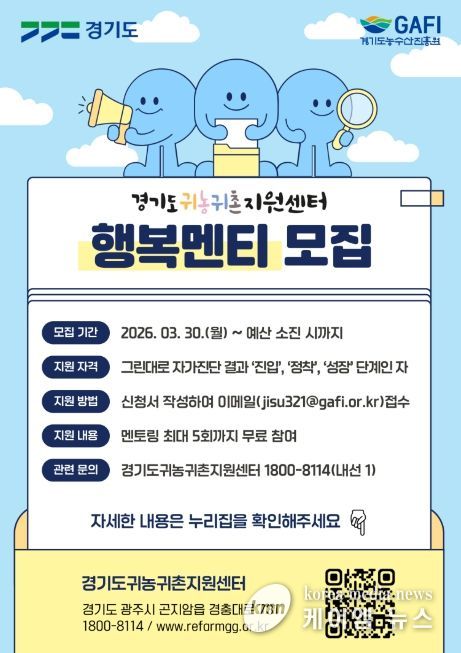 (케이엠뉴스) 경기도와 경기도농수산진흥원이 운영하는 경기도귀농귀촌지원센터는 경기도로 귀농·귀촌을 희망하는 도시민과 초기 정착 단계의 귀농귀촌인을 대상으로 ‘2026년 귀농귀촌 행복멘토링 행복멘티’를 상시 모집한다.