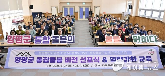 (케이엠뉴스) 양평군은 ‘의료·요양 등 지역 돌봄의 통합지원에 관한 법률(이하 돌봄통합지원법)’ 시행일인 27일 개군면을 시작으로, 4월 3일까지 관내 12개 읍면을 순회하며 ‘양평군 통합돌봄 비전 선포식’과 인적안전망 역량강화 교육을 실시한다고 밝혔다.