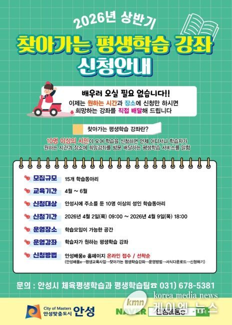 (케이엠뉴스) 안성시는 시민이 원하는 시간과 장소에서 희망하는 강좌를 수강할 수 있는 '2026년 상반기 찾아가는 평생학습 강좌'를 운영한다고 밝혔다.