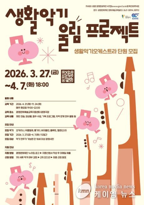 (케이엠뉴스) (재)광명문화재단은 생활악기오케스트라 신규 단원을 3월 27일부터 4월 7일까지 12일간 모집한다.