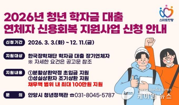 (케이엠뉴스) 안양시가 학자금 대출 상환 연체로 사회활동에 어려움을 겪고 있는 청년들에게 사회 재진입의 발판을 마련하기 위한 ‘청년 학자금 대출 연체자 신용회복 지원사업’ 참여자를 모집한다고 30일 밝혔다.