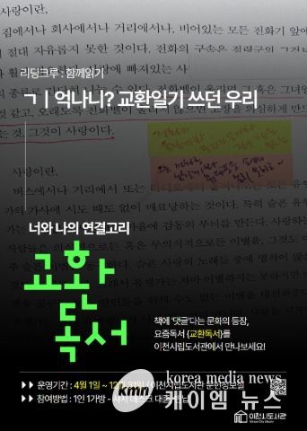 (케이엠뉴스) 이천시립도서관은 시민들이 서로 소통하며 즐겁게 책을 접할 수 있도록, 오는 4월 1일부터 12월 31일까지 시립도서관 문헌정보실에서 ‘리딩크루’ 사업의 일환인 ‘교환독서’ 프로그램을 운영한다.