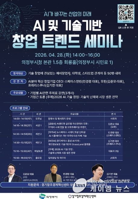 (케이엠뉴스) 의정부시는 ‘2026 첨단산업 스케일업’ 사업의 일환으로 4월 인뎁스(In-depth) 네트워킹과 AI‧기술기반 창업 트렌드 세미나를 개최하고 참여 기업과 시민을 모집한다.
