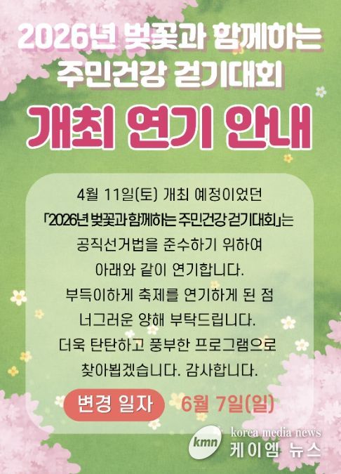 (케이엠뉴스) 홍성군 광천읍과 광천읍주민자치회는 당초 11일 광천읍 하상주차장에서 개최할 예정이었던 ‘2026년 벚꽃과 함께하는 주민건강 걷기대회’ 행사를 6월 7일로 연기한다고 밝혔다.