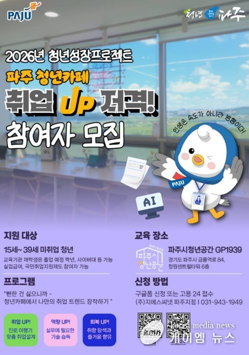 (케이엠뉴스) 파주시는 고용노동부가 추진하는 2026년 청년성장프로젝트의 일환으로 마련한 청년카페 기반 맞춤형 취업지원 사업 ‘취업(UP)저격!’을 본격 운영한다고 밝혔다.