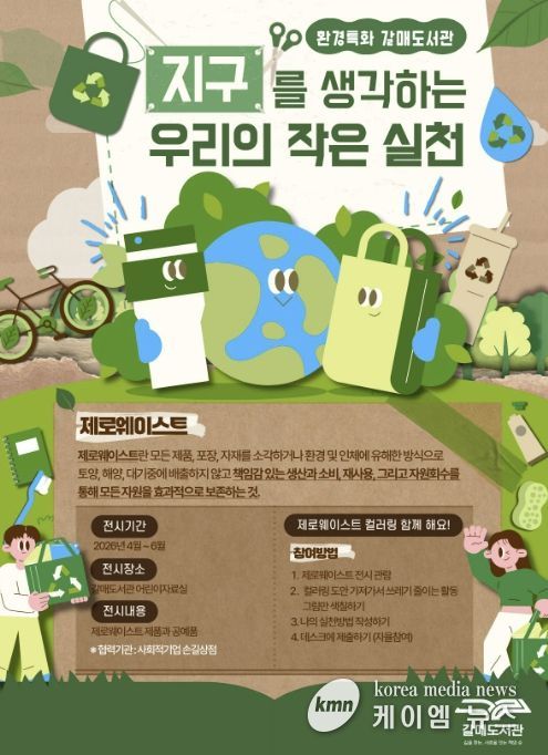 (케이엠뉴스) 구리시 갈매도서관은 2026년 연중 기획 환경 특화 전시 프로그램 ‘사계절 갤러리’의 일환으로, 2분기 전시 '지구를 생각하는 우리의 작은 실천 – 제로웨이스트'를 4월 1일부터 운영한다고 밝혔다.