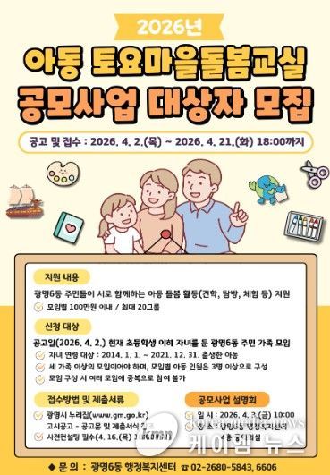 (케이엠뉴스) 광명시 광명6동 행정복지센터는 오는 21일까지 ‘2026년 아동 토요마을돌봄교실 공모사업’에 참여할 주민 가족 모임 20개 팀을 모집한다.