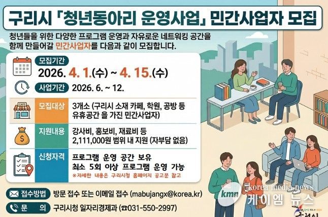 (케이엠뉴스) 구리시는 4월 1일부터 청년들의 자율적이고 창의적인 활동을 지원하기 위한 ‘구리시 청년동아리’를 운영할 민간사업자를 모집한다고 밝혔다.