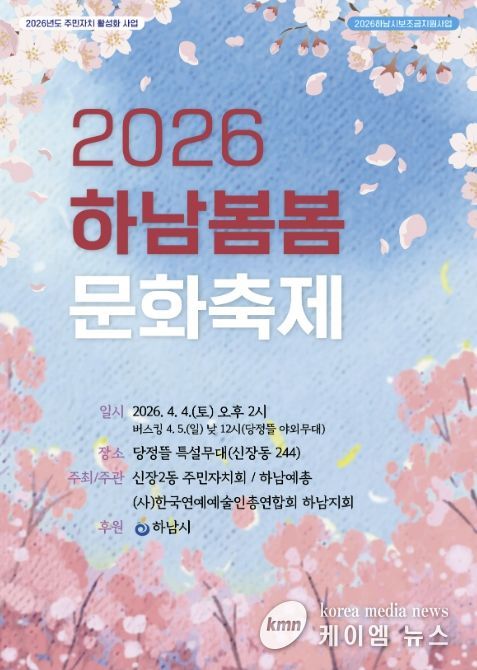(케이엠뉴스) ‘2026 하남 봄봄 문화축제’가 오는 4월 4일 당정뜰 일원에서 열린다. 이번 축제는 신장2동 주민자치회와 (사)한국연예예술인총연합회 하남지회가 공동 주최·주관하고 하남시가 후원한다.