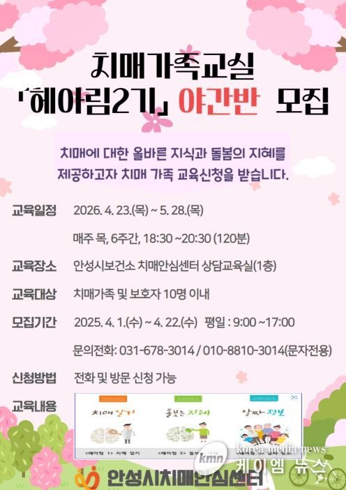 (케이엠뉴스) 안성시보건소 치매안심센터가 직장이나 생업으로 낮시간대 교육받기 어려운 치매환자 가족을 위하여 오는 23일부터 가족교실 야간반을 운영한다.
