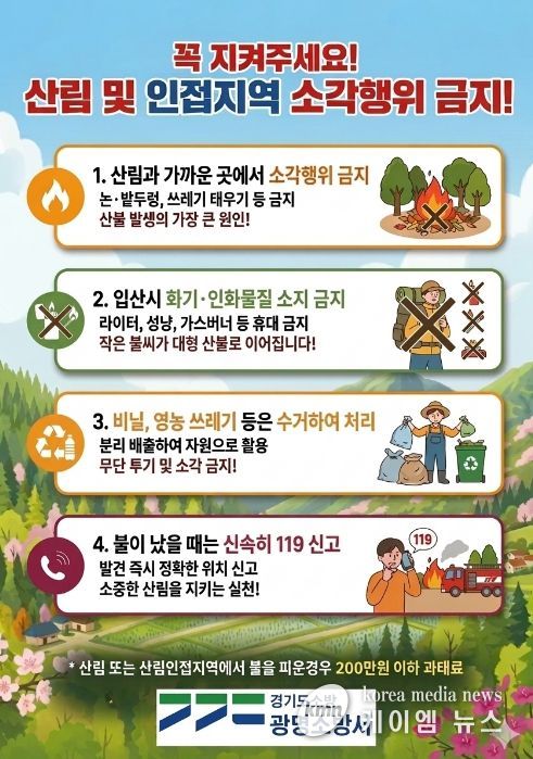 이에 따라 광명소방서는 봄철 기간 동안 산림 인접지역과 주거 밀집지역, 화재취약시설을 중심으로 예방순찰과 안전지도를 강화하고, 시민 대상 화재예방 홍보를 집중 추진할 방침이다. 특히 산림 및 인접지역 소각행위 금지, 담배꽁초 무단 투기 금지, 쓰레기 소각 금지 등 부주의 화재예방 수칙을 적극 안내할 예정이다.