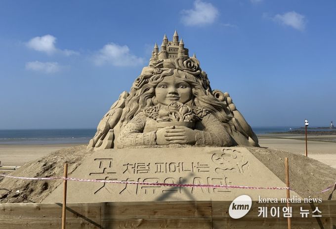 (케이엠뉴스) 태안 안면도 꽃지해수욕장에 초대형 모래조각상이 등장해 관람객의 발길을 끌고 있다