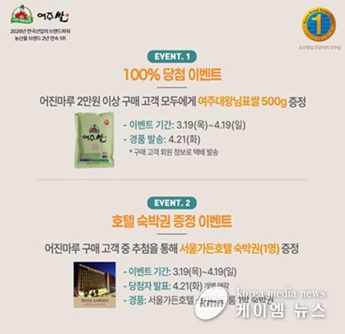 (케이엠뉴스) 여주시 농산업 공동브랜드 활성화센터는 오는 4월 19일까지 어진마루몰에서 여주쌀 2만 원 이상 구매 고객 전원에게 500g 쌀을 추가 증정하는 이벤트를 진행한다고 밝혔다.