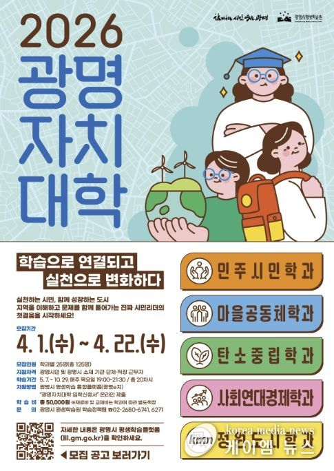 (케이엠뉴스) 광명시가 시의 핵심의제인 평생학습 마을리더 양성과정 ‘광명자치대학’ 2026년 신입생 125명을 오는 22일까지 모집한다.