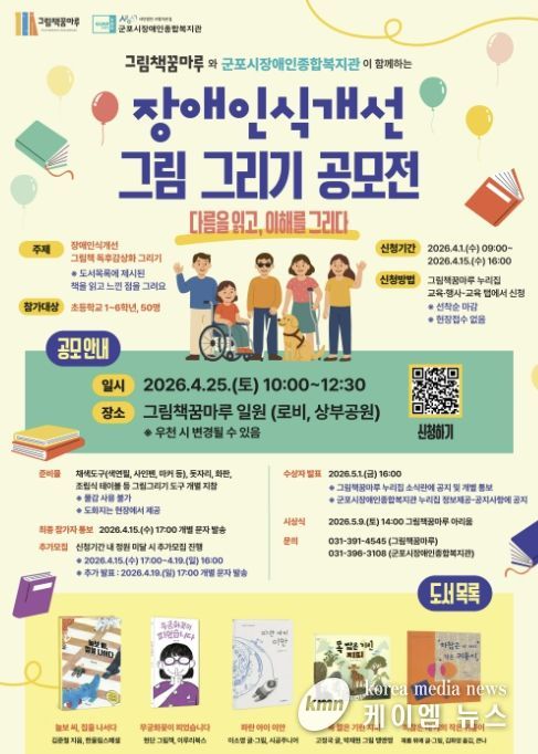 (케이엠뉴스) 군포 그림책꿈마루와 군포시장애인종합복지관이 공동 주관하는 장애인식 개선 그림그리기 공모전이 오는 4월 25일(토) 10시부터 그림책꿈마루 로비 및 상부공원에서 진행될 예정이다.
