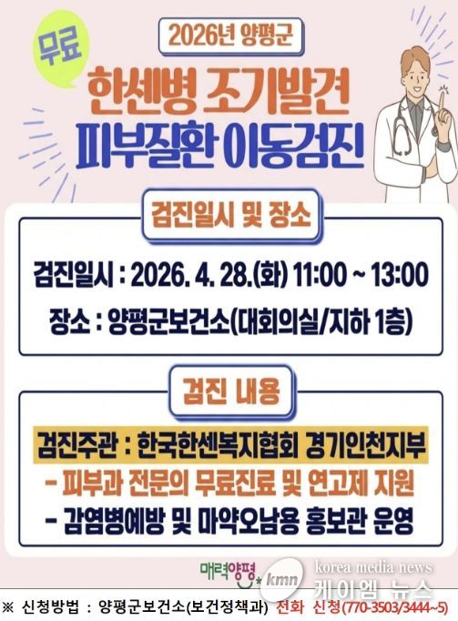 (케이엠뉴스) 양평군은 오는 28일 양평군보건소 지하 1층 대회의실에서 군민을 대상으로 ‘한센병 조기 발견을 위한 피부질환 이동검진’을 실시한다.