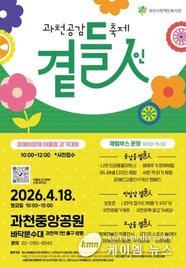 (케이엠뉴스) 과천시장애인복지관은 장애인의 날을 맞아 오는 4월 1일부터 30일까지 한 달간 지역 곳곳에서 장애공감축제 ‘곁들人’을 개최한다. 이번 행사는 지역사회와 함께 장애에 대한 이해를 높이고, 일상 속 포용적 문화를 확산하기 위해 마련됐다.