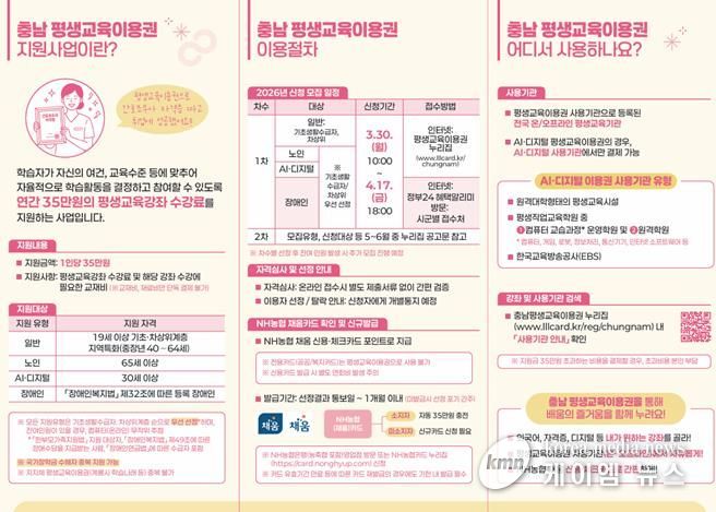 (케이엠뉴스) 충청남도가 도민의 평생학습 기회 확대와 경제적 여건에 따른 교육격차 완화를 위해 2026년 충남 평생교육이용권 1차 신청·접수를 시작했다.