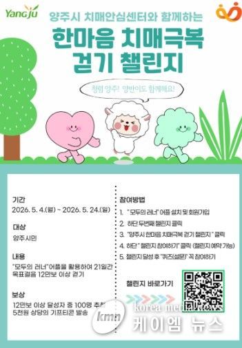 이번 행사는 비대면 방식으로 진행되며, 모바일 앱 ‘모두의 러너’를 통해 참여할 수 있다. 앱 내 ‘챌린지’ 탭에서 ‘양주시 한마음 치매극복 걷기 챌린지’를 선택한 뒤 참여 버튼을 누르면 신청이 완료되며, 사전 예약도 가능하다.