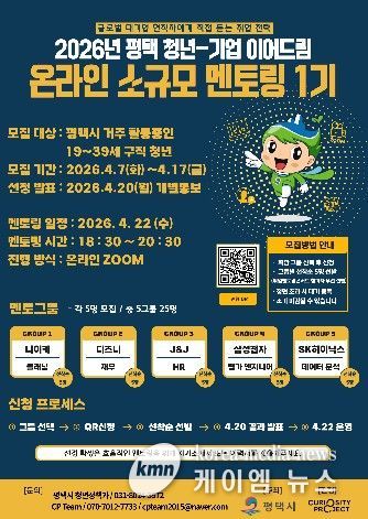 (케이엠뉴스) 평택시는 기업 현직자들의 취업 멘토링을 통해 실질적인 취업 준비를 지원하고 인적 네트워크 형성 기회를 제공하기 위한 평택 청년-기업 이어드림 ‘온라인 소규모 멘토링 1기’ 참여자를 오는 4월17일까지 모집한다.