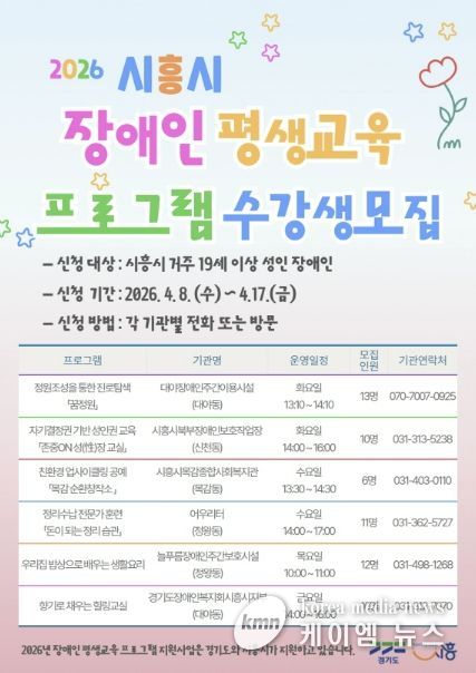 (케이엠뉴스) 시흥시가 관내 성인 장애인의 학습권 보장과 사회참여 확대를 위해 ‘2026년 장애인 평생교육 프로그램 지원사업’을 본격적으로 시작하며, 4월 8일부터 17일까지 프로그램 운영을 위한 학습자를 모집한다.