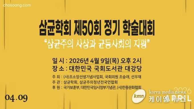 (케이엠뉴스) 2026년 병오년(丙午年)을 맞아 '삼균학회 제50회 정기학술대회'가 국회도서관 대강당에서 개최된다. 이번 학술대회는 (사)조소앙선생기념사업회, 조승래 국회의원실, (사)선우재가 공동 주최하고, 삼균학회와 삼균주의청년연합회가 주관하며, 국가보훈부, 국립대한민국임시정부기념관, (사)한중문화협회가 후원한다.