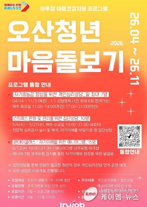 (케이엠뉴스) 오산시는 청년공간 ‘이루잡’이 지역 청년들의 정신건강 증진을 위해 ‘2026 오산청년 마음돌보기’ 프로그램을 오는 4월 14일부터 11월까지 운영한다고 밝혔다.