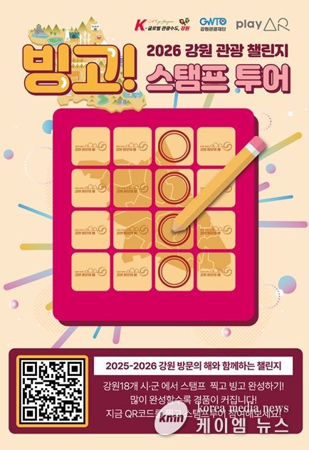(케이엠뉴스) 강원관광재단은 2026년 '강원 방문의 해' 사업의 일환으로 도내 전역을 아우르는 참여형 관광 프로그램‘강원 관광 빙고 챌린지’를 4월 9일부터 본격 운영한다고 밝혔다.