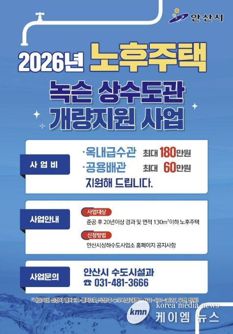 (케이엠뉴스) 안산시는 노후주택 상수도관에서 발생할 수 있는 녹물을 예방하고 안전하고 깨끗한 수돗물을 공급하기 위해 ‘녹물 없는 우리 집 수도관 개량 지원사업’을 추진한다고 9일 밝혔다.