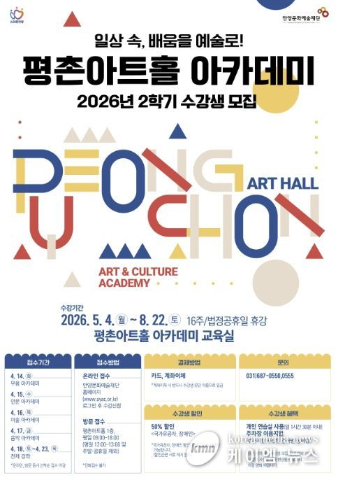 (케이엠뉴스) 안양문화예술재단은 시민 누구나 문화예술을 자유롭게 접하고 즐겁게 배울 수 있도록 오는 4월 14일부터 23일까지 ‘2026년 평촌아트홀 아카데미’ 2학기 수강생을 모집한다.
