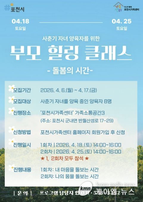 (케이엠뉴스) 포천시 더 큰 행복 포천시가족센터는 사춘기 자녀를 둔 양육자를 대상으로 ‘부모 힐링 클래스’ 참여자를 모집한다.