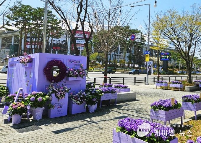 (케이엠뉴스) (재)고양국제박람회재단은 ‘BTS 월드투어 아리랑 인 고양’를 맞이해 2026고양국제꽃박람회 사전 홍보를 위해 ‘보라빛 화훼 포토존’을 일산서구청 앞에 조성했다고 9일 밝혔다.