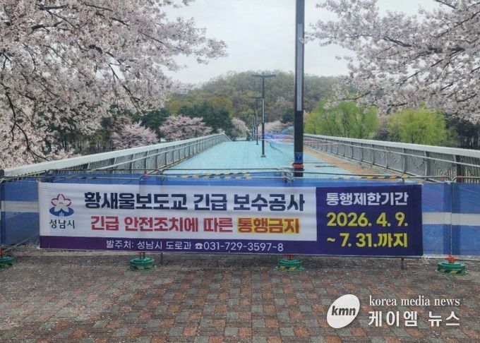 (케이엠뉴스) 성남시는 수내동 소재 탄천을 횡단하는 ‘황새울보도교’에서 구조적 결함인 슬래브 균열이 발견됨에 따라, 시민 안전을 확보하기 위해 4월 9일부터 교량 통행을 전면 금지한다고 밝혔다.