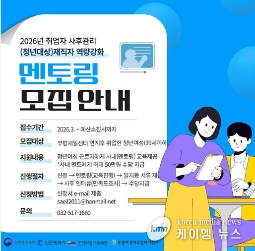 (케이엠뉴스) 부평여성새로일하기센터는 청년여성의 안정적인 취업과 경력유지 지원을 위해 '2026년 재직자 역량강화(멘토링) 사업' 참여기업을 모집한다고 밝혔다.