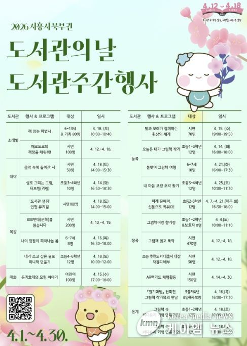 (케이엠뉴스) 시흥시 북부권 공공도서관은 4월 12일 ‘도서관의 날’과 4월 12일부터 18일까지 이어지는 ‘도서관주간’을 기념해 다양한 독서문화 행사와 현장 참여 이벤트를 4월 한 달간 운영한다.