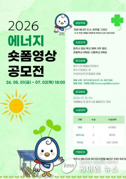 (케이엠뉴스) 파주시는 청소년들의 에너지 인식을 제고하고 디지털 미디어 활용 역량을 강화하기 위해 녪년 파주시 청소년 에너지 숏폼 영상 공모전’을 개최한다.