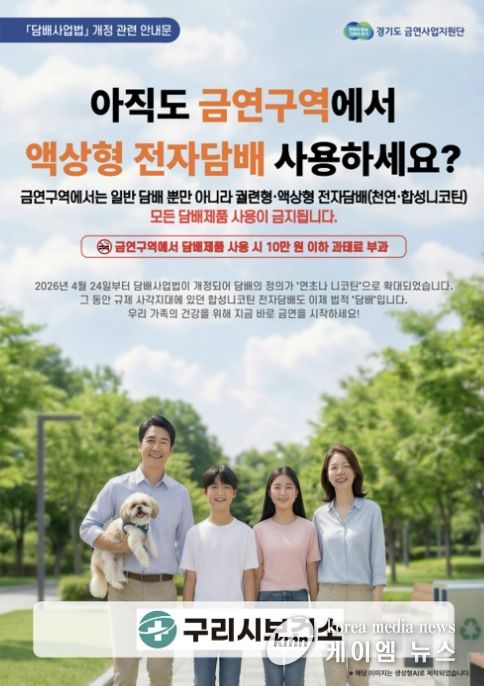 (케이엠뉴스) 구리시 보건소는'담배사업법' 및 '국민건강증진법' 개정으로 담배의 정의가 확대됨에 따라, 지역사회 내 담배 규제 사항을 점검하고 금연 문화를 확산하기 위해 4월 24일부터 금연 구역 점검·단속과 금연 홍보 운동을 한다고 밝혔다.