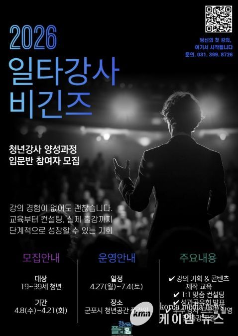 (케이엠뉴스) 군포시 청년공간 플라잉(센터장 조남)은 강의 역량을 갖춘 청년을 발굴하고 전문 강사로 성장시키는 ‘2026년 일타강사 비긴즈’의 입문반 참여자를 오는 21일까지 모집한다.