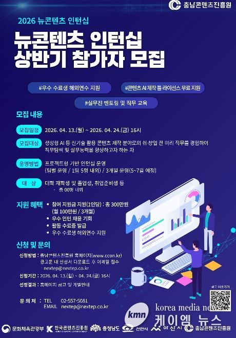 (케이엠뉴스) 충남콘텐츠진흥원은 도내 콘텐츠 산업 인재 양성과 일자리 창출을 위해 ‘2026 뉴콘텐츠 인턴십’ 상반기 참가자를 모집한다고 밝혔다.
