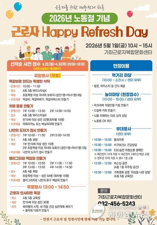 (케이엠뉴스) 인천시설공단 가좌근로자복합문화센터가 내달 1일 노동절을 맞아 근로자와 가족이 함께 즐기는 소통 행사를 마련, 다채로운 프로그램을 운영한다.
