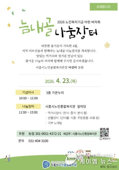 (케이엠뉴스) 시흥시노인종합복지관은 오는 4월 23일 오전 10시부터 지역 어르신과 주민이 함께 어우러지는 나눔의 장 ‘늠내골 나눔장터’를 노인복지관 앞마당에서 개최한다.