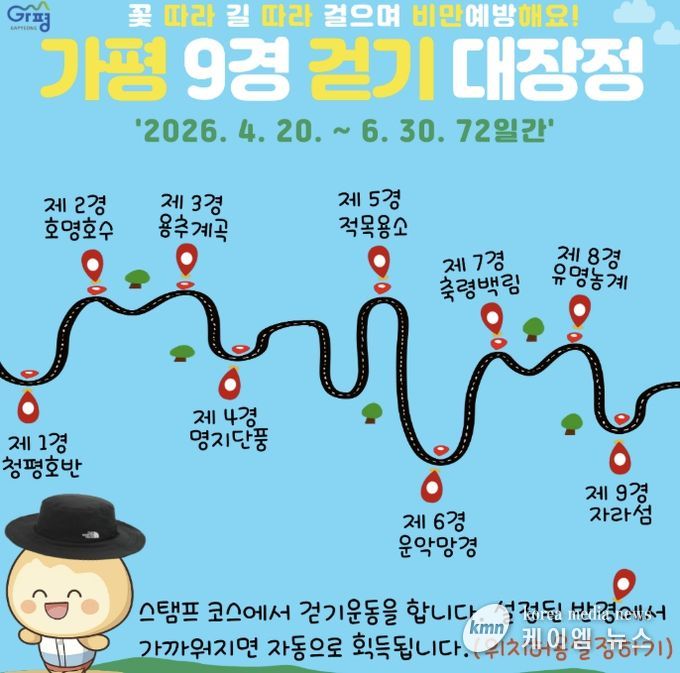(케이엠뉴스) 가평군의 수려한 자연경관을 배경으로 건강을 다지는 ‘2026 가평 9경 걷기 대장정’이 오는 20일부터 시작된다. 가평군보건소는 군민들의 비만을 예방하고 걷기 실천율을 높이기 위해 이번 프로그램을 마련했다고 15일 밝혔다.