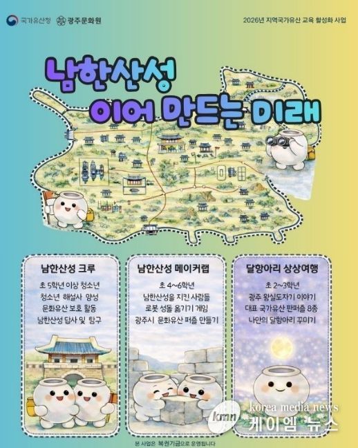 (케이엠뉴스) 광주시는 국가유산청 공모사업인 ‘2026년 지역국가유산 교육 활성화 사업’에 선정되어 광주문화원이 시행하는 ‘남한산성, 이어 만드는 미래’를 4월말부터 본격 운영할 예정이다.