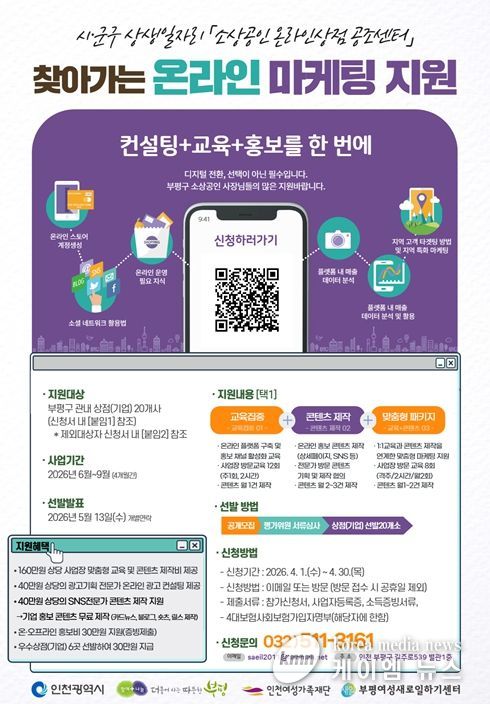 (케이엠뉴스) 부평여성새로일하기센터는 소상공인의 온라인 판로 확대와 디지털 경쟁력 강화를 위해 시-군·구 상생일자리 '소상공인 온라인상점 공조센터' 사업의 일환으로 ‘찾아가는 온라인 마케팅 지원사업’ 참여 상점(기업)을 모집한다고 밝혔다.