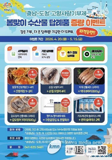 (케이엠뉴스) 충남도는 오는 20일부터 5월 15일까지 지역 수산물 소비 촉진 및 고향사랑기부제 활성화를 위한 ‘답례품 증량 이벤트’를 진행한다고 16일 밝혔다.