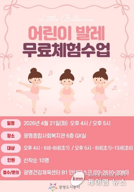 운영 프로그램은 K-POP 댄스와 어린이 발레 2개 종목으로 구성된다. 상세 일정은 ▲어린이 발레 4월 21일 ▲K-POP 댄스 4월 22일이며, 광명종합사회복지관 6층 GX실에서 진행될 예정이다.